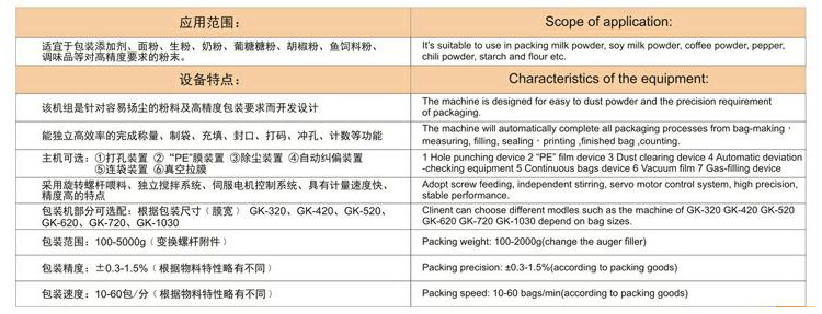 自動完成制袋,計(jì)量,下料,封合,分切,計(jì)數(shù)等功能,適用粉末物料的自動計(jì)量包裝機(jī)。